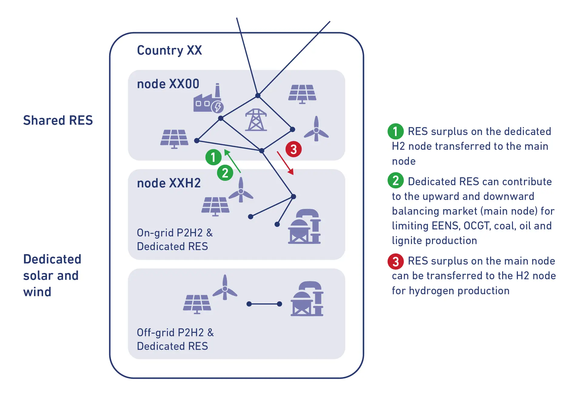 - The volume of renewable hydrogen produced never exceeds the dedicated renewable power generation (plus the surplus of RES generation connected on the main node), within any given time interval of the model (typically based on an hourly granularity, consistent with market mechanisms and metering devices).